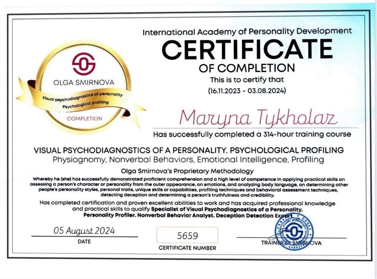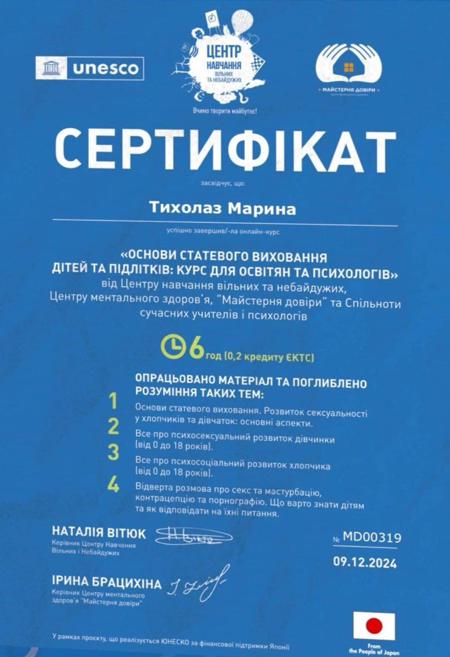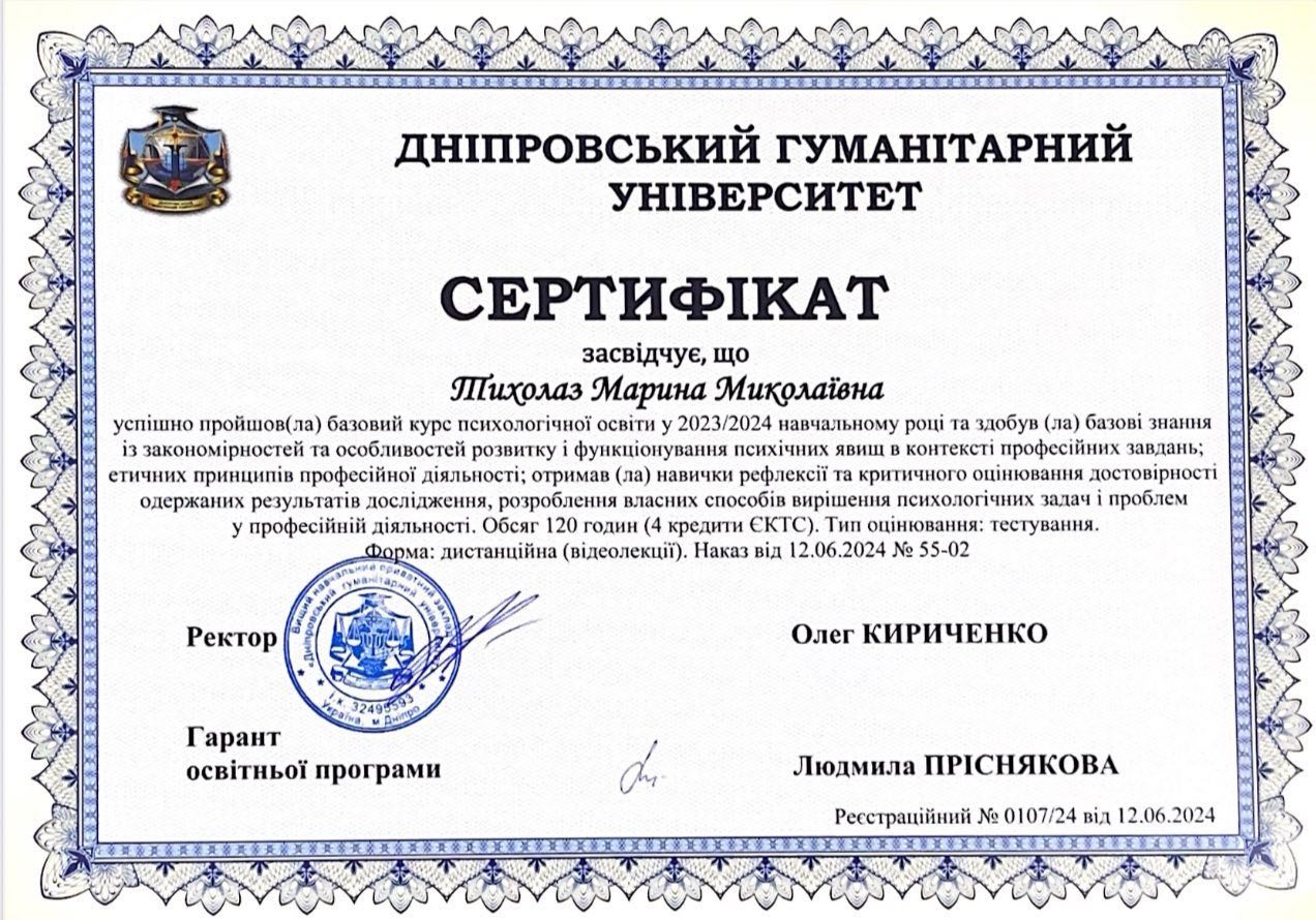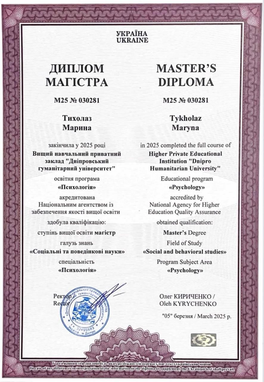 Я- Тихолаз Марина, практикуючий психолог, магістр психології, дитячий психолог, психодіагност.